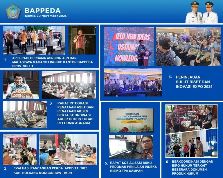 Pacificnews.id-.Badan Perencanaan Pembangunan Daerah (Bappeda) Provinsi Sulawesi Utara (Sulut) melaksanakan serangkaian agenda kerja yang sangat padat pada Kamis (20/11/2025). Kegiatan ini mencakup koordinasi strategis lintas sektor, evaluasi anggaran, hingga peninjauan inovasi daerah.